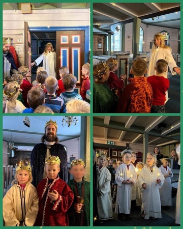Barnehagegudsteneste: Ein føremiddag i desember tek vi buss til kirka. Der møter vi andre barnehagar frå Stranda tettstad og syng julesongar for kvarandre. Presten fortel den kristne juefortellinga.